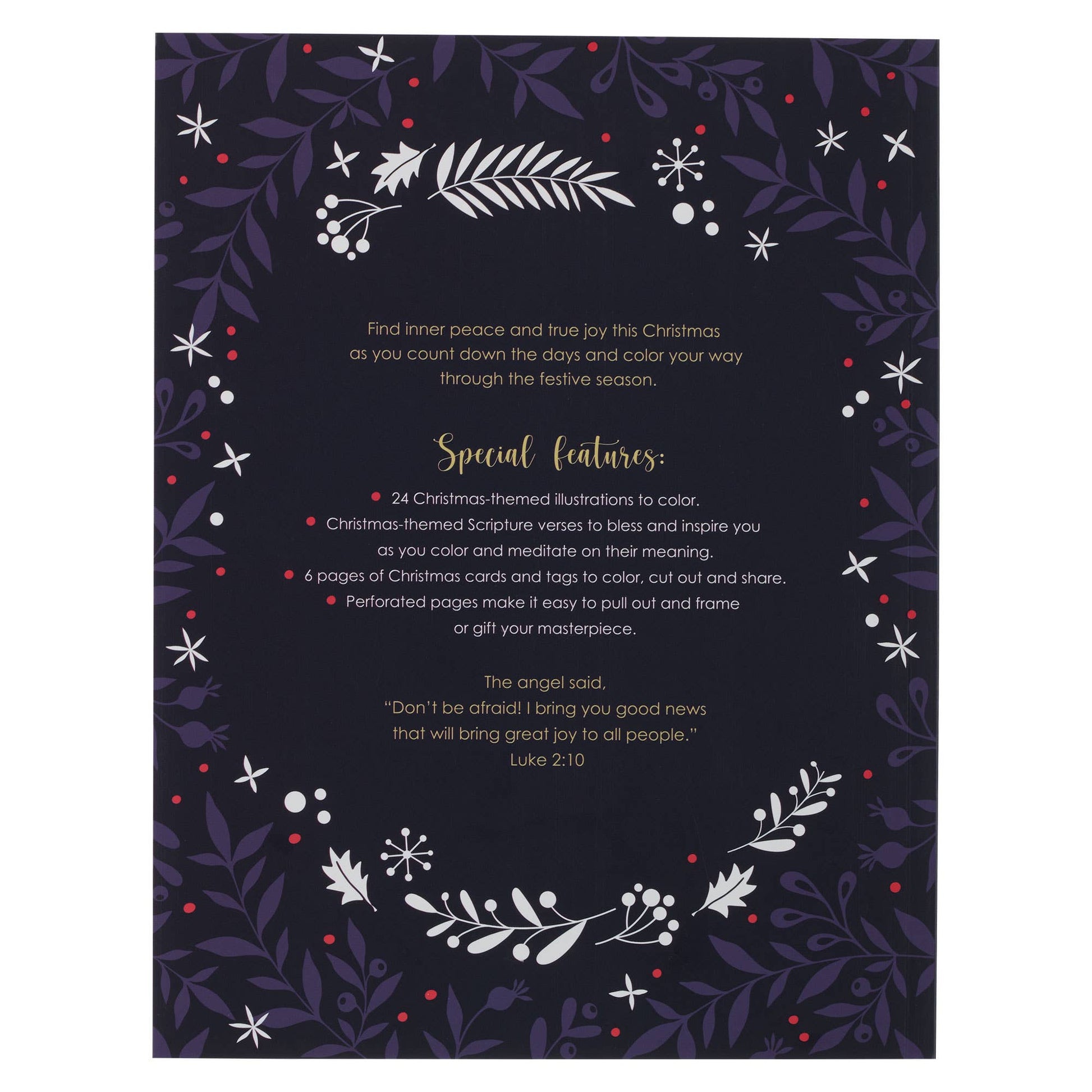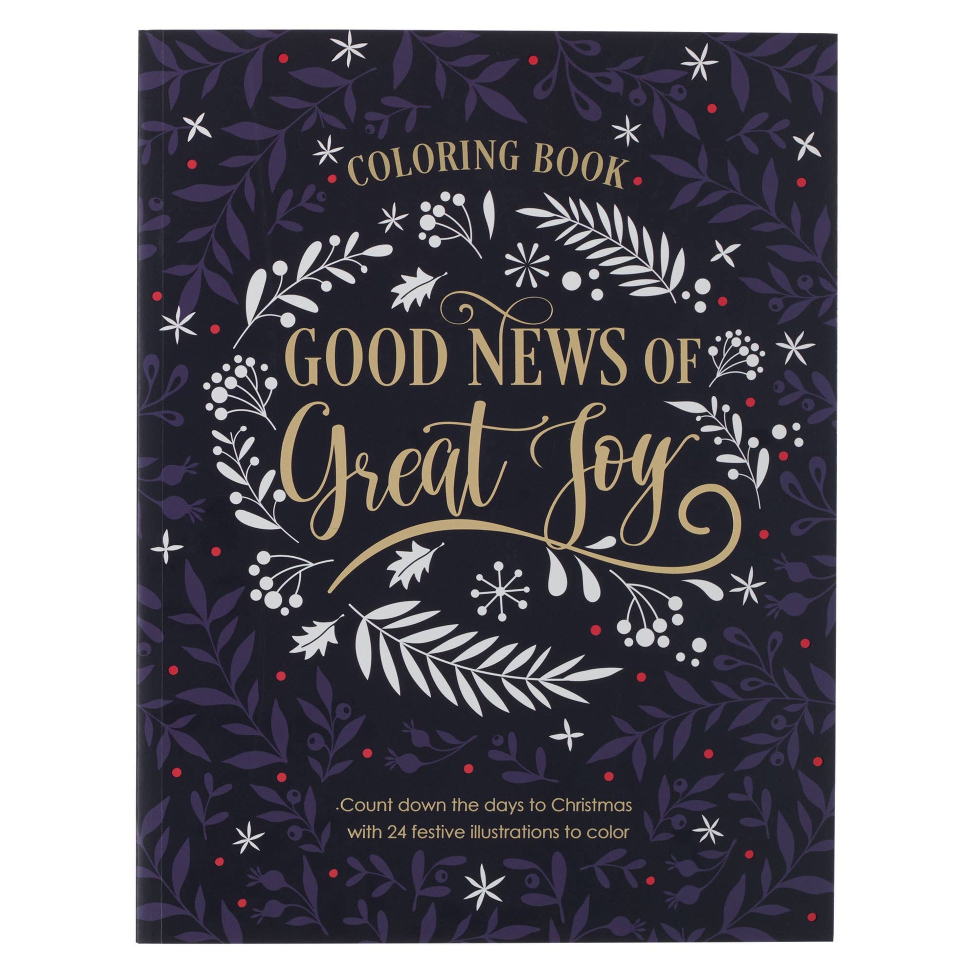 Black background with purple leafy sprigs and white Christmas-themed decorative elements, Gold-foiled title, Good News of Great Joy, Coloring book for adults, Advent coloring book, Softcover, One color interior, 52 pages, Printed on one side, 50 full-page designs to color, 18 gift tags to color, 6 mini cards to color, 4 midi cards to color, 24 advent cards to color, 13 placement cards to color, 21 Christmas tree decorations to color, Cards to color, Perforated and easy-to-tear-off pages, Size: 11" x 8.5" x .3" (279 x 216 x 8mm)