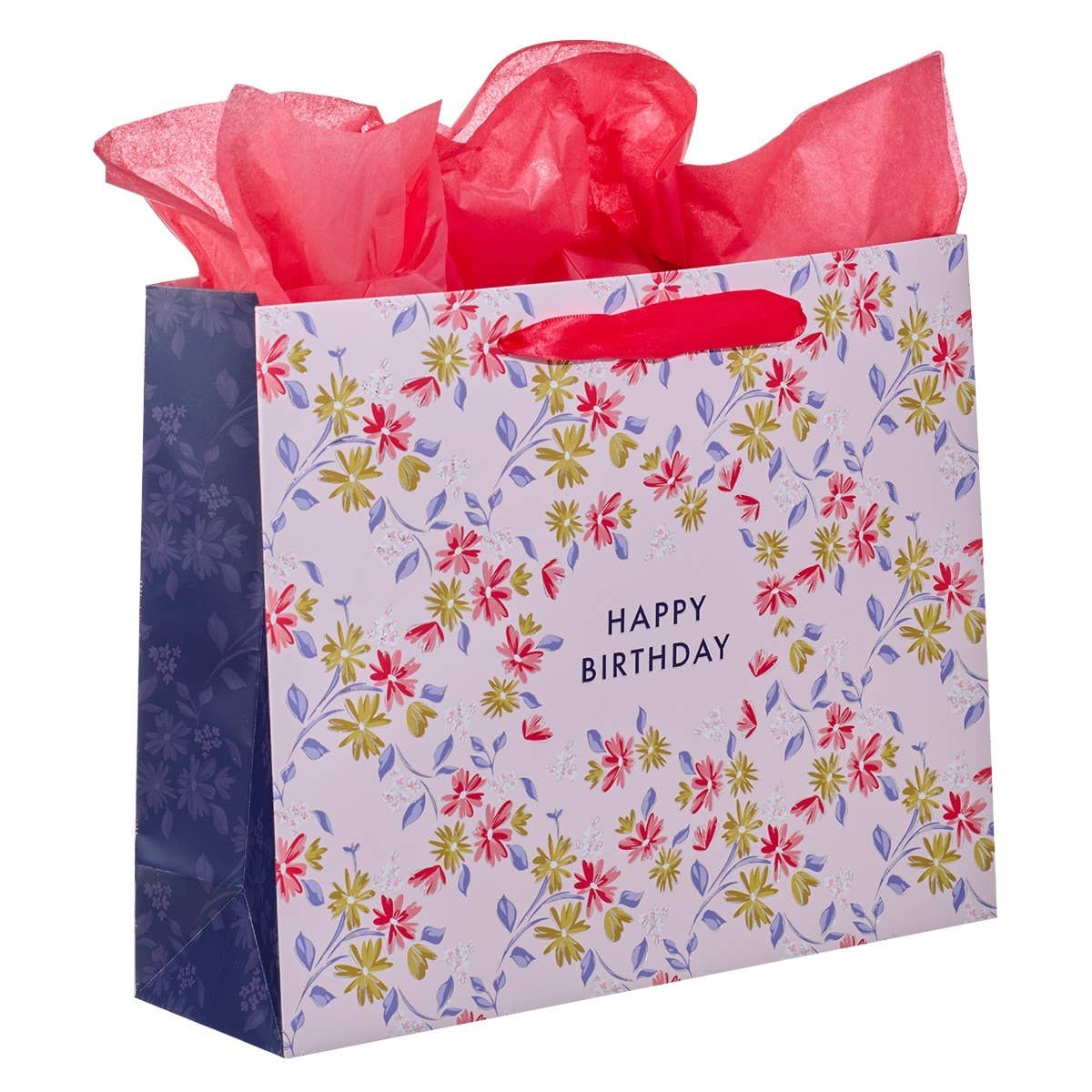 Large landscape gift bag, Pink, green, and lavender floral design, Bright pink satin ribbon handles, Two sheets of bright pink tissue paper included, Coordinating blank card with envelope included decorated in inverse colors, Card size: 6" x 4" (152 x 102mm), Gift bag size: 12.5" x 10" x 3.9" (318 x 254 x 99mm)